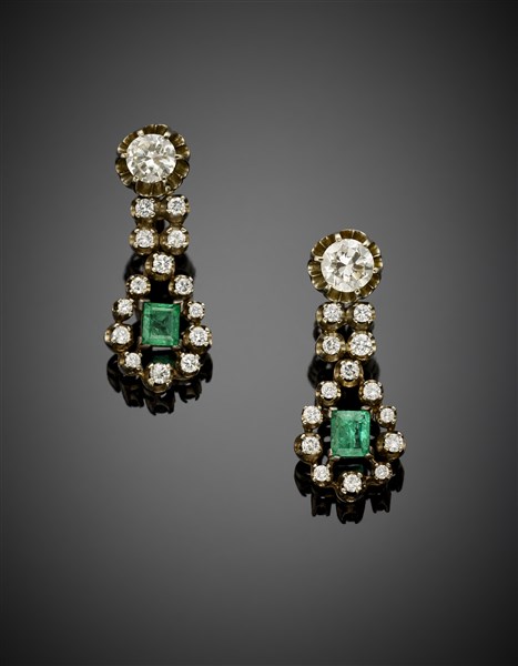 Diamond in all ct. 2.70 circa and emerald in all ct. 1.00 circa white gold pendant earrings, the two main diamonds ct. 1 circa and ct. 0.90 circa, the pendants are removable and the diamonds worn as solitaire, g 9.36 circa, length cm 3.50 circa.