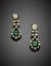 Orecchini pendenti in oro bianco rifiniti con diamanti per complessivi ct. 2,70 circa di cui i maggiori di ct. 1 circa e di ct. 0,90 circa, smeraldi per complessivi ct. 1,00 circa, i pendenti possono essere smontati e i solitari indossati da soli, g 9,36 circa, lungh. cm 3,50 circa.