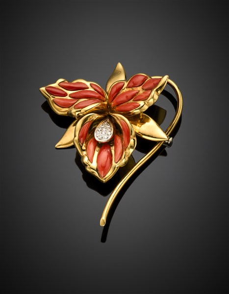 Lotto 1021 | Spilla in oro giallo a guisa di fiore rifinita con coralli e diamanti, spillone