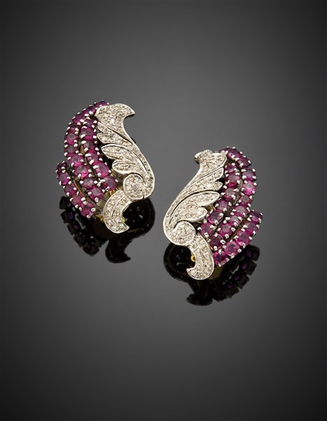 Orecchini a guisa di ali in oro giallo e argento dorato bianco, con rubini e piccoli diamanti, g 13,50 circa, lungh. cm 3,20 circa.