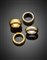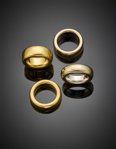 Gruppo di quattro anelli a fascia in oro bianco e giallo, uno reca ancora tracc