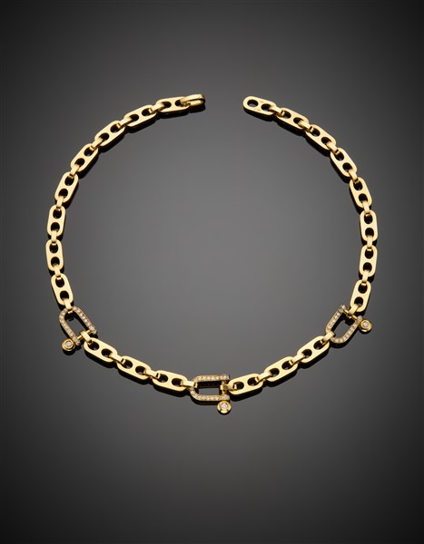 *Collier a catena a maglia marinara in oro giallo con tre distanziatori a "grillo" rifiniti in diamanti, g 62,64 circa, lungh. cm 40,20 circa. Marcata Ronchi, 830 MI.