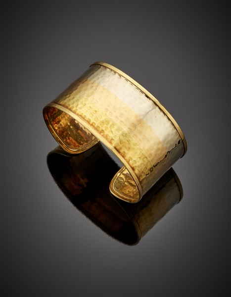 Three-colour gold hammered cuff bracelet, g 31.58 circa, h cm 3.10, diam. cm 6 circa circa. (slight defects)