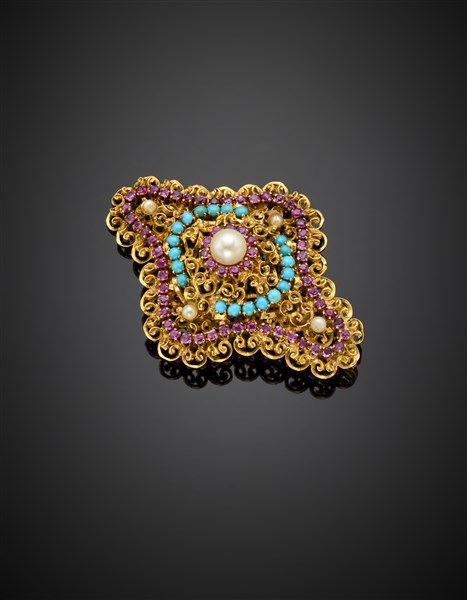 Pearl, turquoise and pink corundum yellow gold brooch/pendant, g 19.30 circa, length cm 5.20 circa. Marked 568 AL.