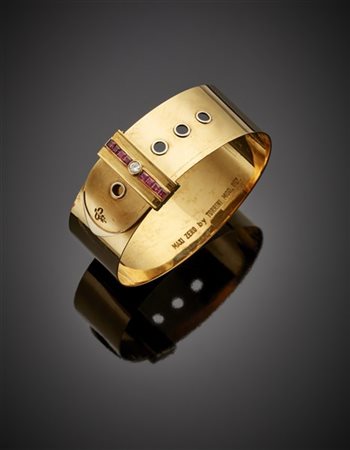 Yellow gold adjustable belt bracelet with carré ruby and ct. 0.15 circa diamond clasp, g 40.20 circa, diam. cm 6.20 circa. Signed and marked Maxi Zero by Torrini, Torrini, 504 FI. In original case