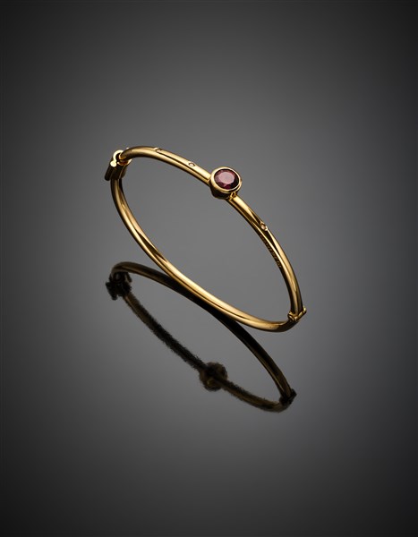 Bracciale rigido apribile in oro rosa con granato e diamanti, g 22,27 circa, diam. cm 6 circa. Firmato e marcato Manfredi, 1968 MI.