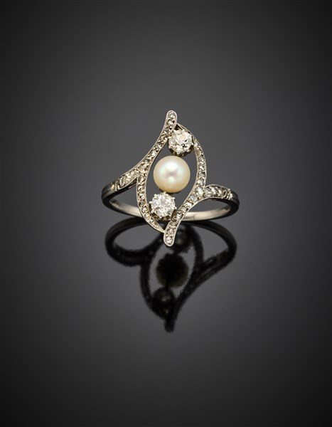 Anello in oro bianco con diamanti rotondi e a mezza rosetta per complessivi ct. 0,40 circa rifinito con una perla di mm 5,80 circa, g 4,55 circa misura 21/61.