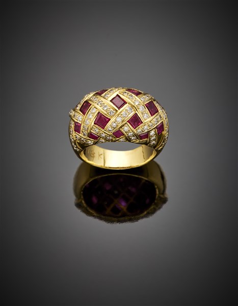 Yellow gold calibré ruby and diamond ring, g 13.65 circa size 13/53.