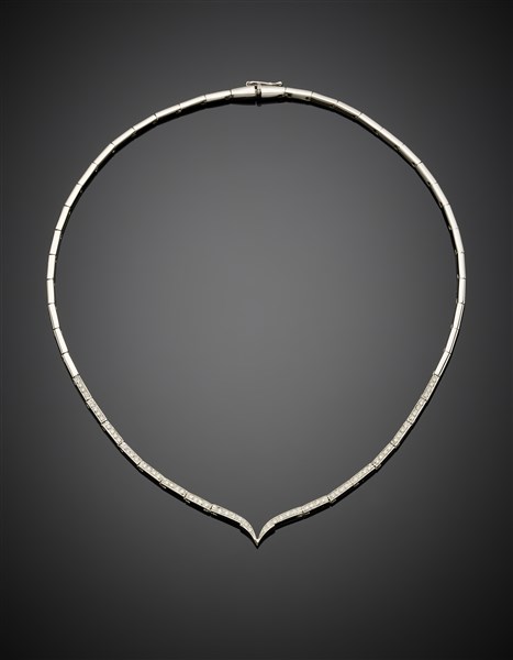 Collier articolato in oro bianco rifinito con diamanti per complessivi ct. 0,70 circa, g 22,52 circa, lungh. cm 42 circa.