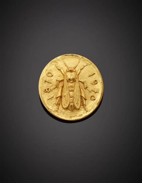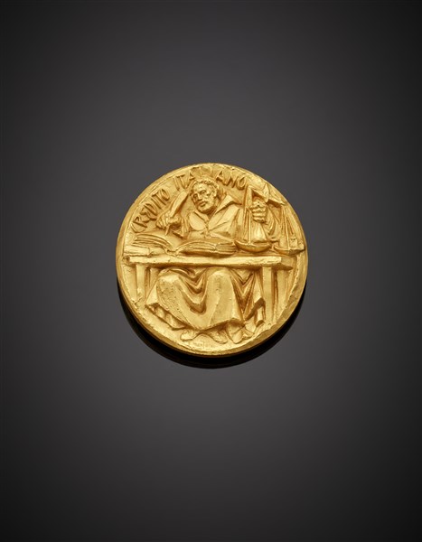Yellow matte gold celebrative medal for the hundredth anniversary of CREDITO ITALIANO, 1870 - 1970, g 38.63 circa, diam. cm 3.20 circa. Signed, with logo and marked E. Manfrini, ESM, 701 MI.