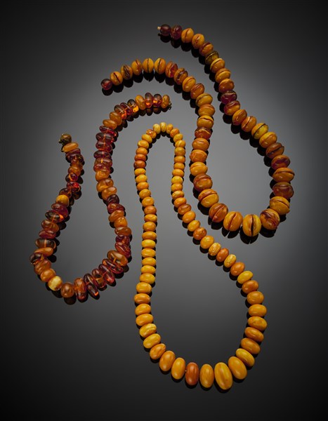 Lot comprising three graduated bead and half bead amber necklaces, one of cm 64 circa without clasp, one of cm 57 circa with metal clasp and one of cm 67.50 circa with a screw clasp, overall bead diam. from mm 10 to mm 24 circa, in all g 336.48 circa.