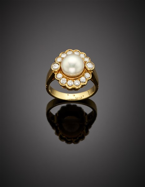 Anello in oro giallo con perla coltivata a bottone di mm 8,25 circa,e diamanti rotondi per complessivi ct. 0,50 circa, g 6,82 circa misura 12/52. Marcato 147 TO.