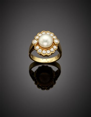 Cultured mm 8.25 circa button pearl and diamond yellow gold cluster ring, in all ct. 0.50 circa g 6.82 circa size 12/52. Marked 147 TO.