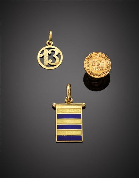 Lotto in oro giallo composto da un charm con numero "13" in oro giallo, un pendente con smalti giallo e blu e un pin con stop in metallo, netti g 6,35 circa.