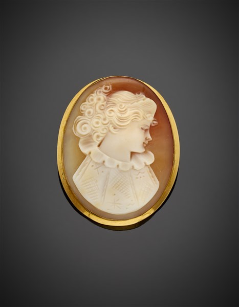 Spilla/pendente in oro giallo e cammeo in conchiglia con profilo femminile, g 6,39 circa, lungh. cm 4,3 circa. Marcata 743 NA.
