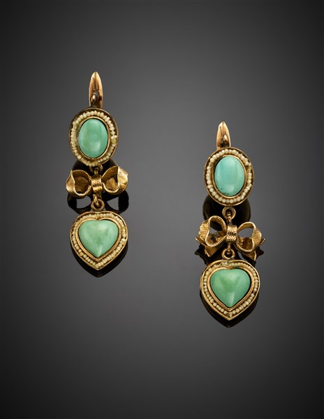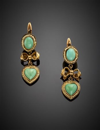 Yellow 9K gold oval and heart shape turquoise pendant earrings accented with seedpearl, g 9.01 circa, length cm 3.80 circa. Marked 488 NA. (defects)