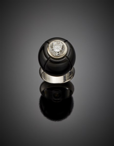 Anello in oro bianco, onice scolpita e pietra incolore, g 16,10 circa misura 12/52.