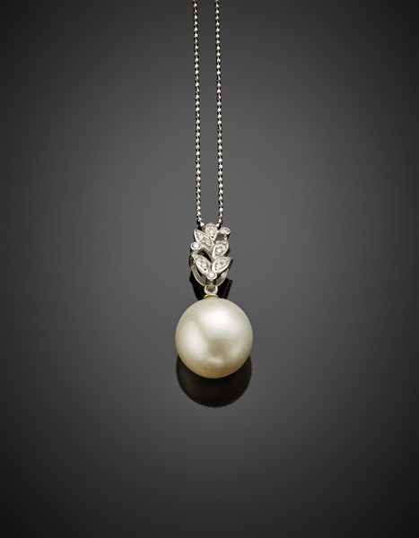 White 9K gold mm 14 circa cultured pearl and diamond pendant with adjustable white 18K gold chain of cm 45 circa, g 7.05 circa, length cm 3.20 circa.