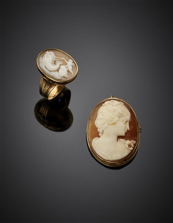 Yellow gold and shell cameo lot comprising a ring size 15/55 with Cupid and a cm 3.90 pendant brooch with a female profile, in all g 12.11 circa. (slight defects)