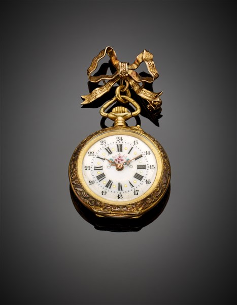 Orologio da tasca in argento dorato con spilla a fiocco in oro giallo, g 24,13