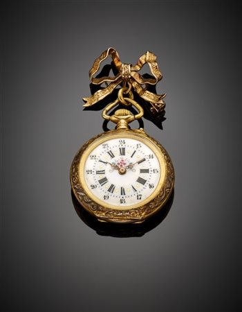 Orologio da tasca in argento dorato con spilla a fiocco in oro giallo, g 24,13 circa, lungh. cm 6 circa. Marchi svizzeri e italiani. (difetti)