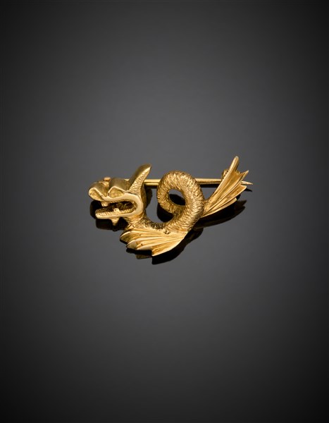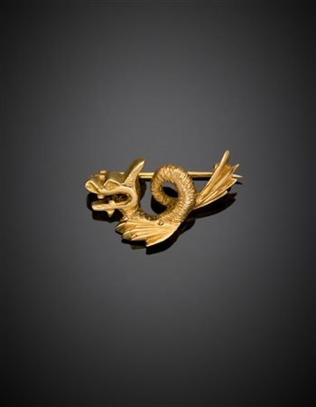 Yellow gold dragon pin, g 4.65 circa, width cm 2.20 circa.