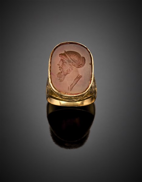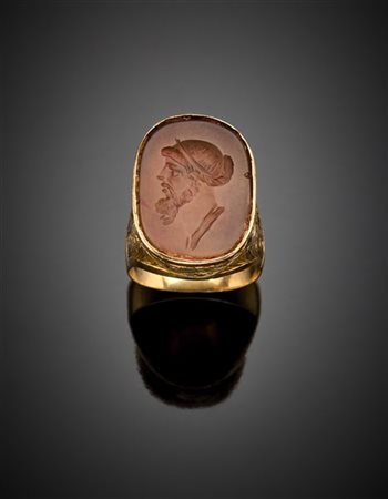 Yellow 14K chiseled gold with resin intaglio and secret compartment, g 15.66 circa size 18/58.