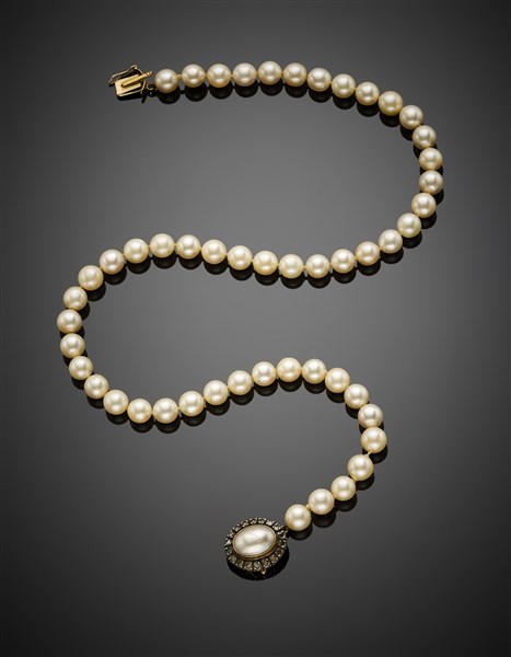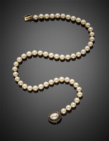 Cultured mm 7.50/7.80 circa pearl necklace with silver and gold mother-of-pearl and rose cut diamond clasp, g 40.01 circa, length cm 45.50 circa. Clasp marked 472 FI.