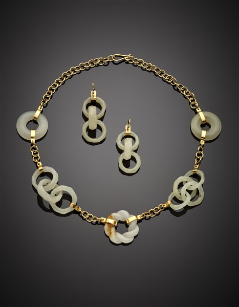 Yellow gold and carved jadeite jewellery set comprising cm 42 circa necklace and cm 5.50 circa pendant earrings, in all g 42.01 circa.
