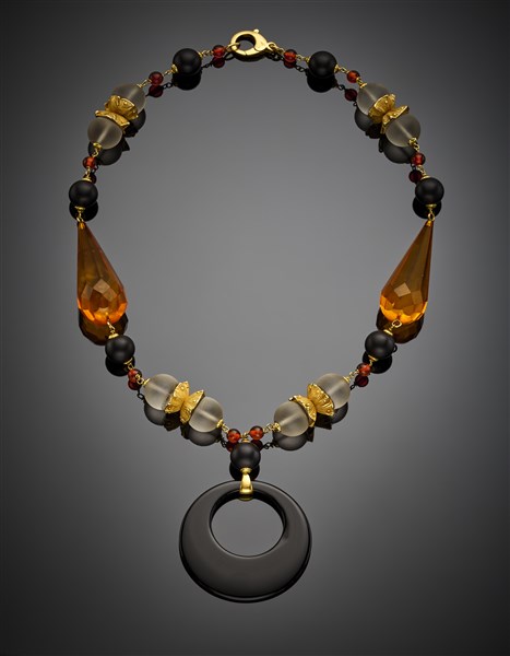 Collier in oro giallo, quarzo ialino, ambra, al centro pendente in onice, dettagli in paste vitree, g 96,16 circa, lungh. cm 53 circa. Marcato 1706 MI. (lievi difetti)