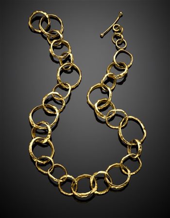 Collier ad anelli in oro giallo martellato e traforato g 64,83 circa, lungh. cm 51,30 circa. Con custodia