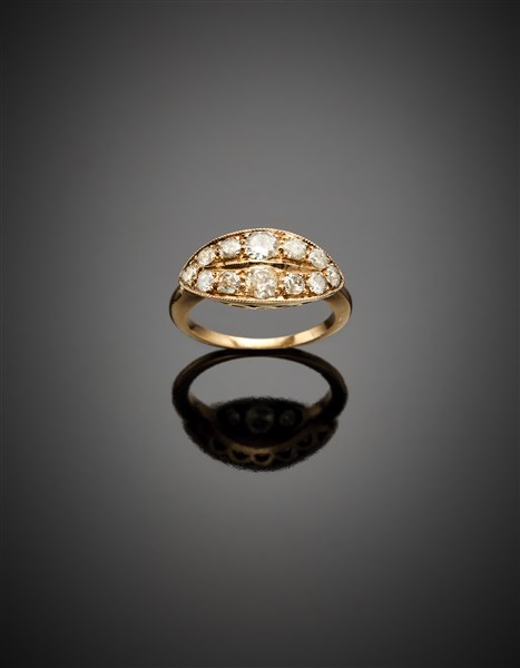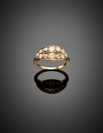 Anello in oro giallo 333/1000 rifinito con diamanti per complessivi ct. 1 circa, g 3,97 circa misura 16/56.