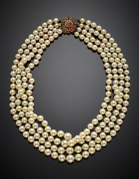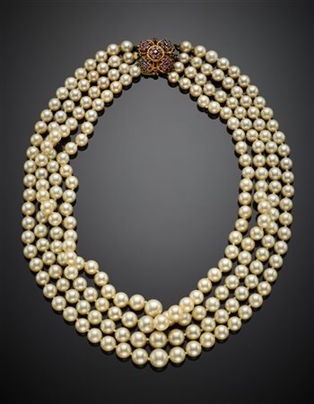 Collana quattro fili di perle coltivate a scalare da mm 5,85 a mm 9,35 circa, lungh. primo filo interno cm 39 circa, g 115,84 circa. (difetti)
