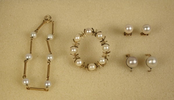 Firmato. Lotto composto da due coppie di orecchini, una spilla e un bracciale in oro e perle. XX secolo.