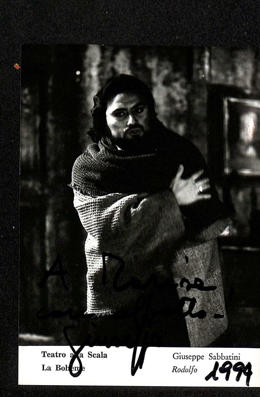 Ritratto autografo con dedica datata 1994 del tenore lirico , direttore d'orchestra e contrabbassista . Il suo repertorio operistico comprende Idomeneo , Mitridate, re di Ponto , Don Giovanni , Linda di Chamounix , La favorita , L'elisir d'amore , Anna Bolena , Maria Stuarda , Roberto Devereux , Lucrezia Borgia , Dom Sébastien , I puritani , Rigoletto , La Traviata , Falstaff , La Bohème , Eugene Onegin , Auber's Fra Diavolo , Werther , Manon, Thaïs , La Damnation de Faust , Benvenuto Cellini , Les Contes d'Hoffmann , Orphée aux Enfers , Les Pêcheurs de Perles e il Faust di Gounod . Ha cantato nei principali teatri d' opera del mondo, come La Scala (la sua base abituale), la Staatsoper di Vienna , la Royal Opera House , Covent Garden e altri. Sabbatini ha fatto il suo debutto acclamato negli Stati Uniti nel febbraio 2001, al Metropolitan di New York , cantando il ruolo tenorile principale in di Massenet Manon . Film per la TV sono stati realizzati con Giuseppe Sabbatini nelle opere Robert Devereux (1997), La Traviata (2001) e La Damnation de Faust (1999). È disponibile in commercio una registrazione di una presentazione televisiva di una Tokyo Boheme del 1993 con Daniela Dessì nei panni di Mimi. Giuseppe Sabbatini ha vinto diversi concorsi vocali nazionali e internazionali, come il Premio Jussi Björling nel 1987, il Premio Caruso e il Premio Lauri Volpi nel 1990, il Premio Abbiati 1991 per l'interpretazione vocale e il Premio Tito Schipa 1996 . Il 25 aprile 2003 Sabbatini ha ricevuto il titolo di Kammersänger dalla Staatsoper di Vienna. Ritratto fotografico in vesti di scena con dedica autografa datata Milano 1993.