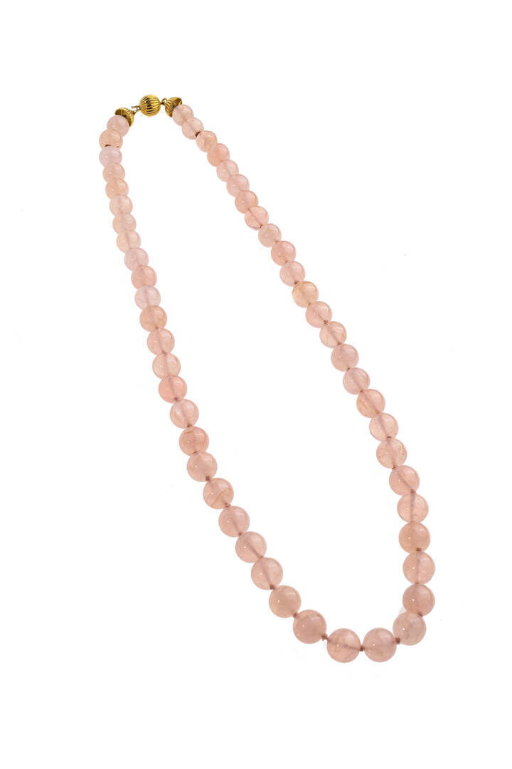 composto da sfere di quarzo rosa dal diam di mm 10 a 10.8. Chiusura in oro giallo a sfera fesonata