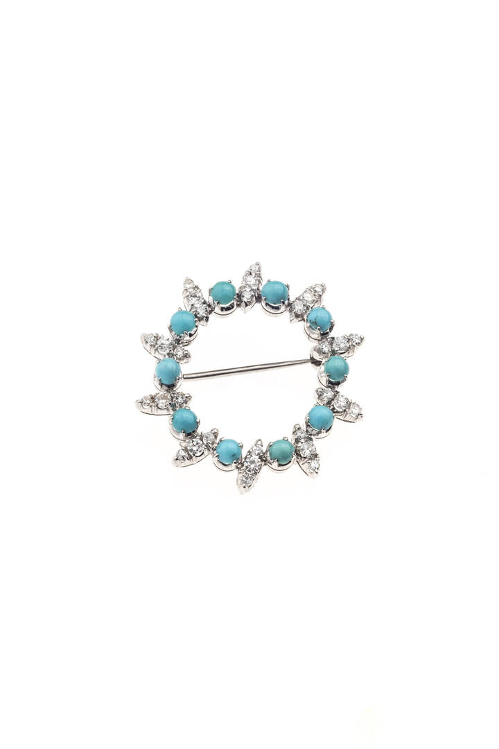 in oro bianco, di forma rotonda, con diamanti taglio brillante e 8/8 per totali ct 0,35 ca, alternati a sfere di turchesi