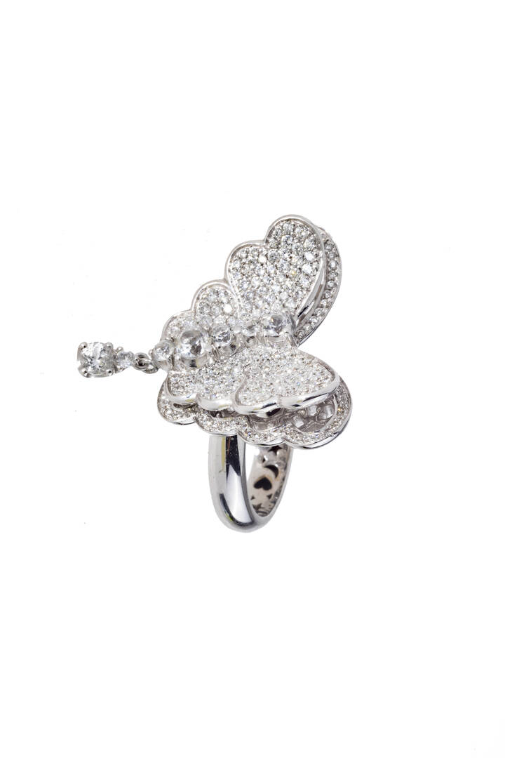 Anello in oro bianco, firmato "Pasquale Bruni", a forma di farfalla, con ali in diamanti taglio brillante per totali ct 1,50 ca e corpo centrale con cristalli di rocca