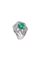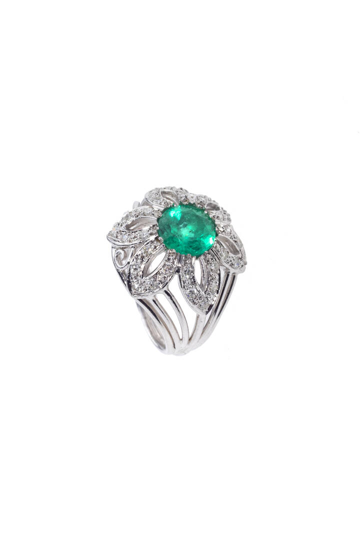 in oro bianco, sommità bombata, gambo composto da sei fili, al centro smeraldo taglio rotondo di ct 1,50 ca (lieve scheggiatura) e diamantini taglio 8/8 disposti a fiore per totali ct 0,30 ca