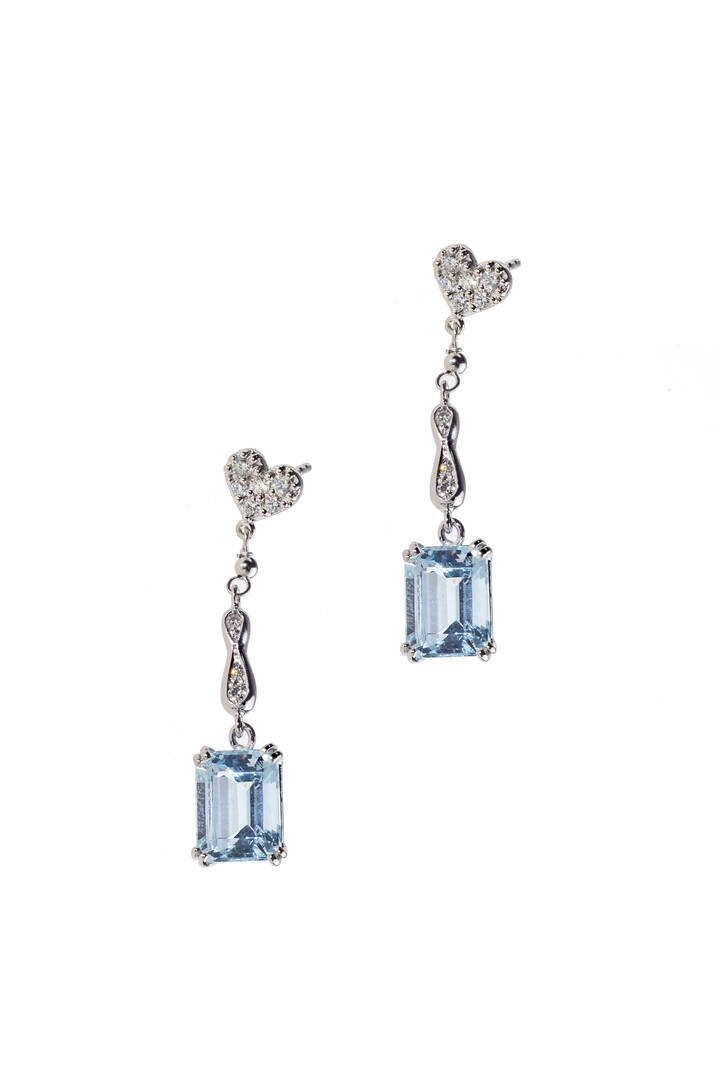 pendenti in oro bianco con due acquamarine taglio ottagonale a gradini; ai lobi piccoli cuori in diamanti taglio brillante per totali ct 0,15 ca