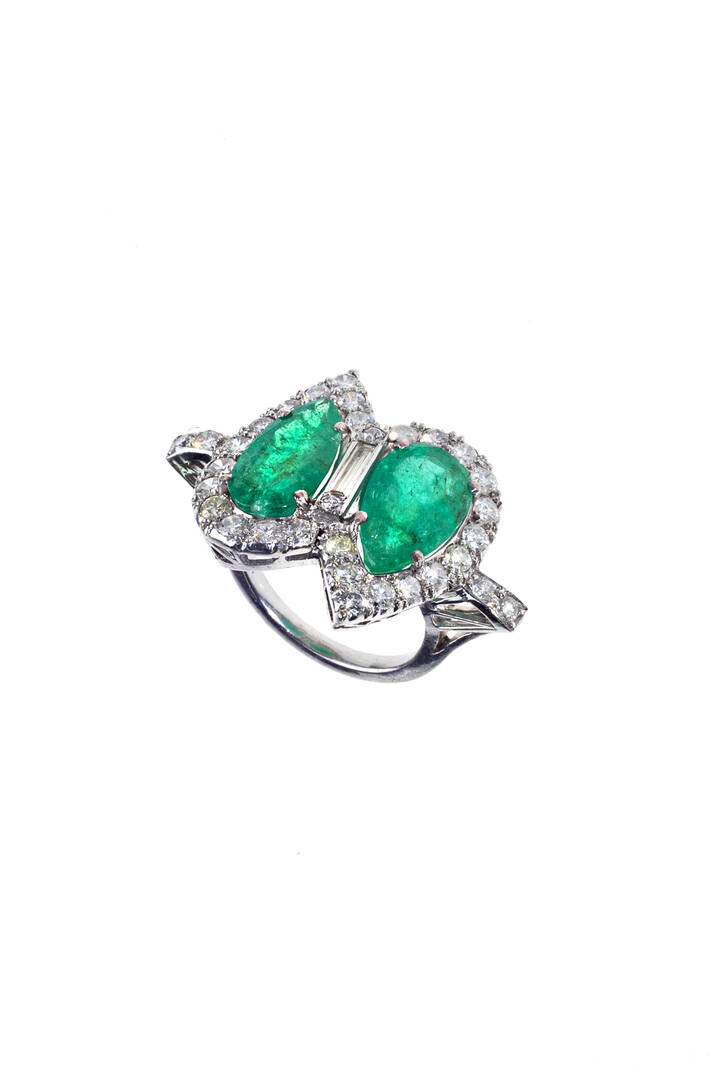in oro bianco, modello contrarié, con gocce di smeraldo per totali ct 6 ca e diamanti taglio brillante e baguette a contorno per totali ct 1,50 ca