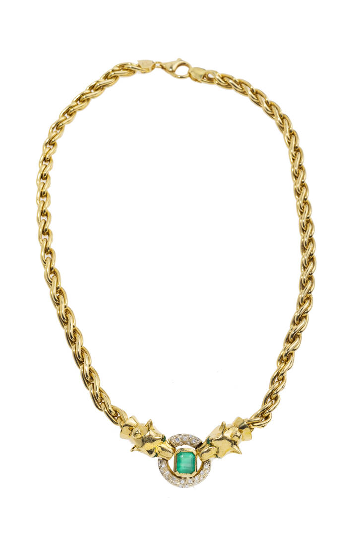 in oro giallo, lavorato a maglia a corda; al centro due teste di pantera trattenenti un disco con pavé di diamanti taglio brillante per totali ct 0,20 ca e smeraldo taglio ottagonale a gradini di ct 1,0 ca