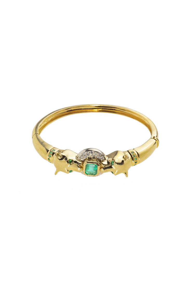 rigido in oro giallo; al centro due teste di pantera trattenenti disco con pavé di diamanti taglio brillante per totali ct 0,20 ca e smeraldo centrale taglio ottagonale a gradini di ct 1,0 ca