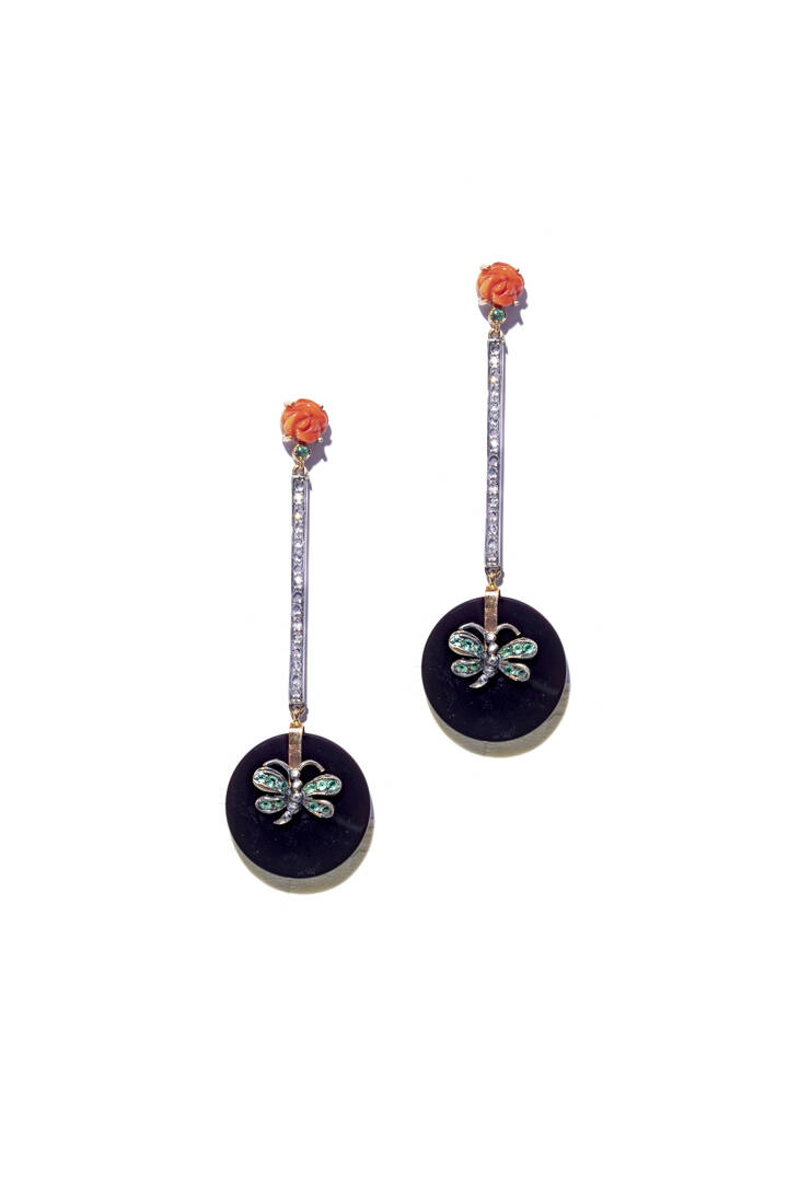 pendenti, in argento ed oro giallo a bassa caratura; ai lobi due rose in corallo; corpo composto da barrette rigide con rosette di diamanti per totali ct 0,60 ca, terminanti con due dischi di onice con due farfalle stilizzate con smeraldi