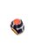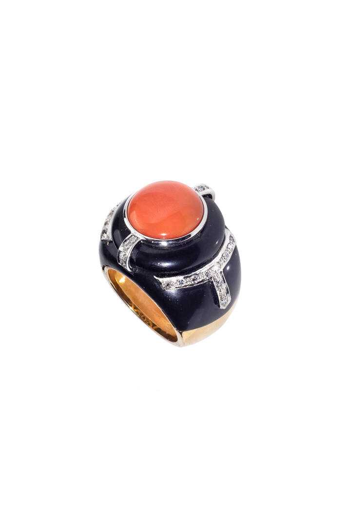 in oro rosa e bianco 9 Kt, sommità bombata e sagomata in onice con inserti in diamanti taglio 8/8 a decoro ed al centro disco di corallo color salmone