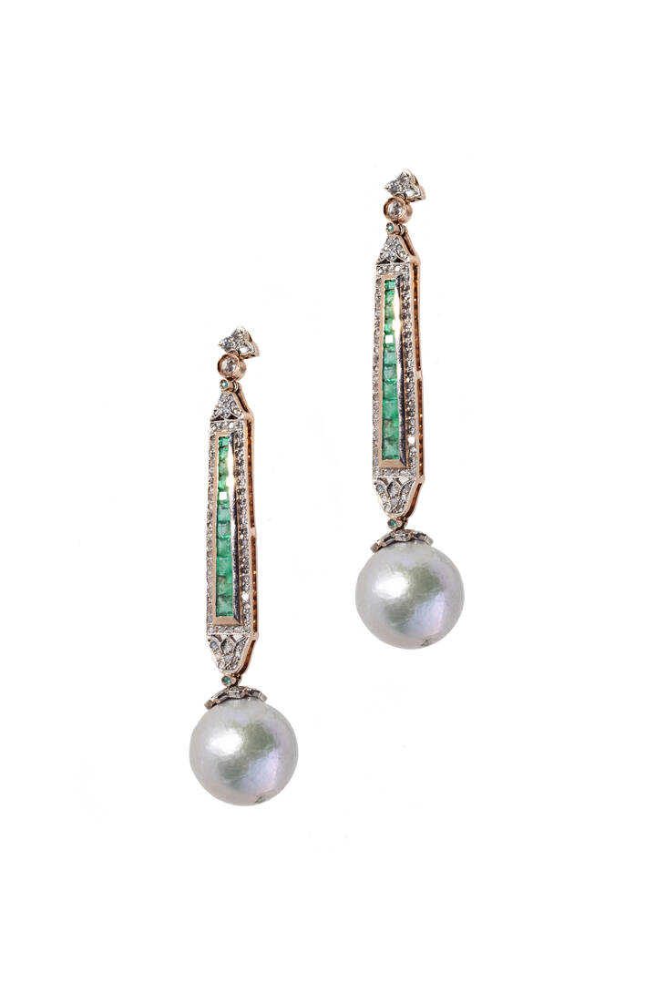 in argento e oro rosa 14 Kt, con corpo a barretta con fila di smeraldi taglio carré per totali ct 2,0 ca e piccole rosette di diamanti per totali ct 0,80 ca, terminanti con due perle di acqua dolce del diam di mm 16,5