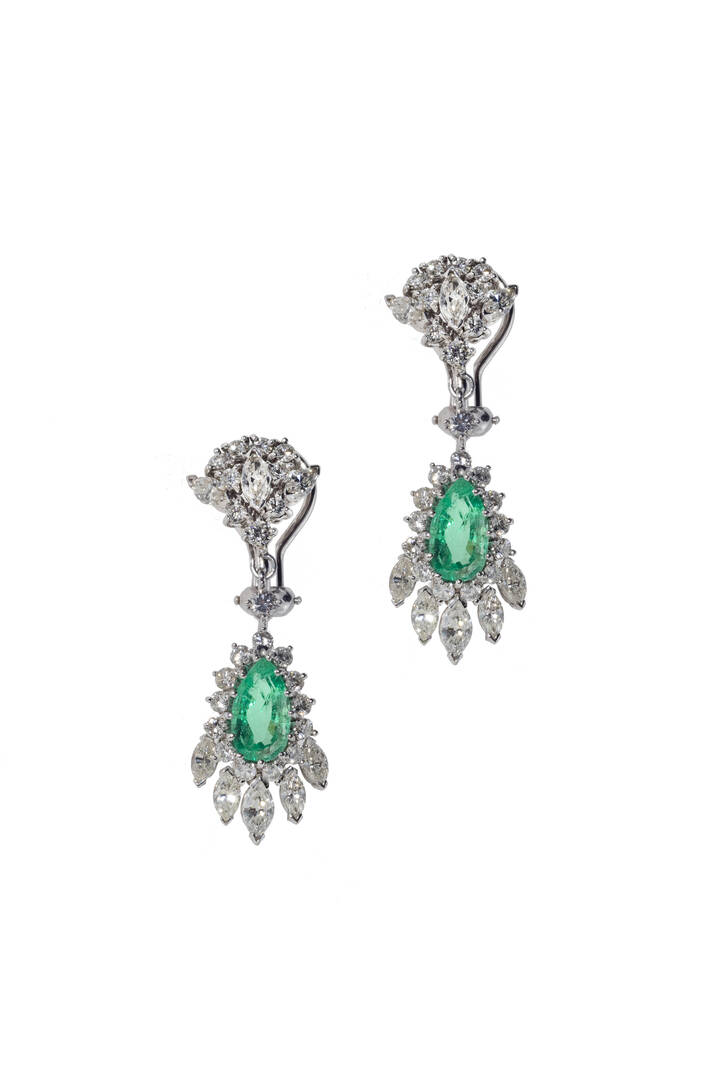 pendenti, in oro bianco, con diamanti taglio brillante e navette per totali ct 3,0 ca; due gocce di smeraldi per totali ct 3,0 ca
