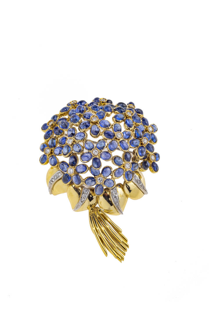 in oro giallo e bianco, a forma di mazzo fiorito, con zaffiri cabochon per totali ct 18 ca e piccoli diamanti taglio brillante per totali ct 0,60 ca