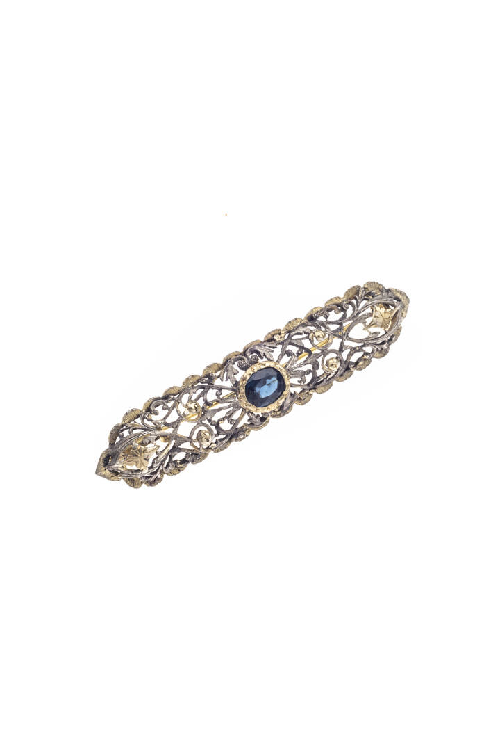 in oro a bassa caratura ed argento, a barretta, con zaffiro centrale taglio ovale di ct 0,60 ca