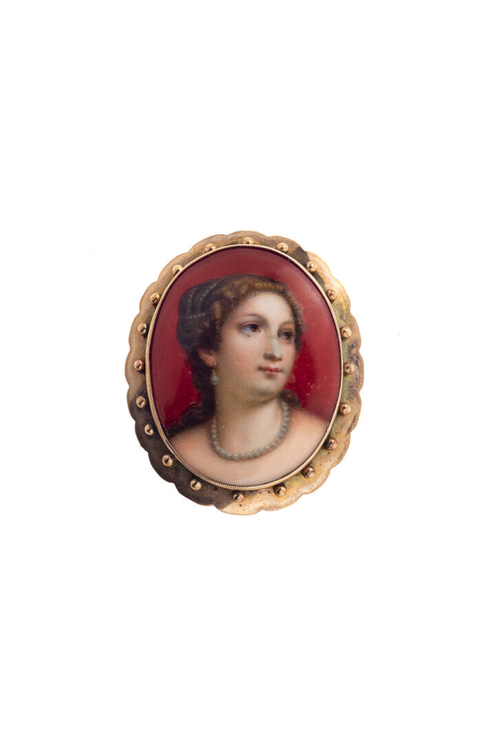 in oro rosa a bassa caratura, XIX secolo, di forma ovale, con miniatura su porcellana raffigurante ritratto di fanciulla